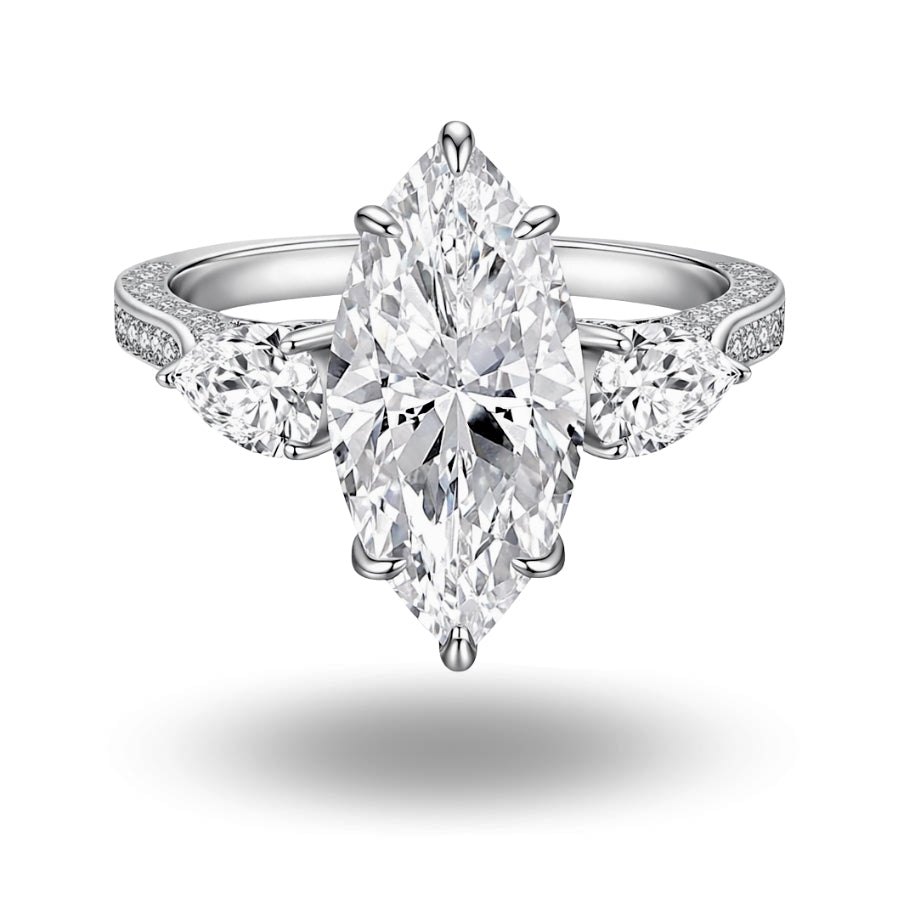 Striking in scale and sculptural beauty, the Edith Ring showcases a commanding 7.0-carat marquise-cut diamond simulant, expertly set to elongate and flatter the finger. Flanked by two pear-cut side stones and finished with a pavé-set band, this piece captures light from every angle, offering a dazzling interplay of brilliance and refinement. A dramatic centrepiece, crafted for those who embrace bold elegance.