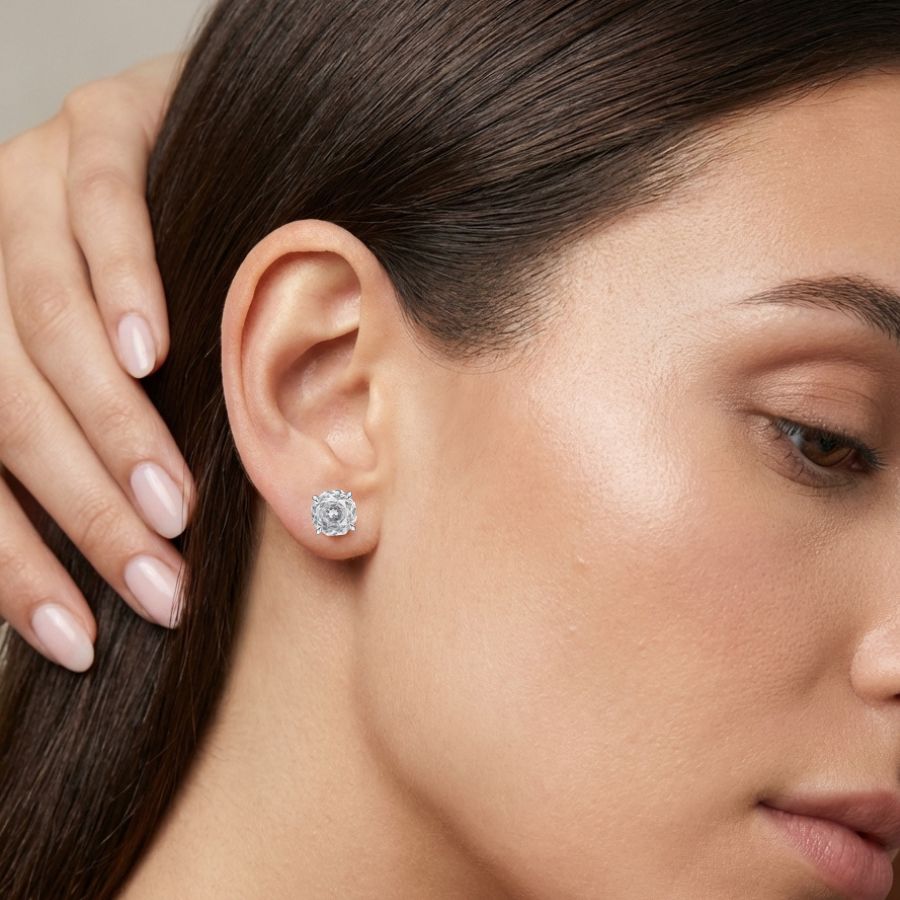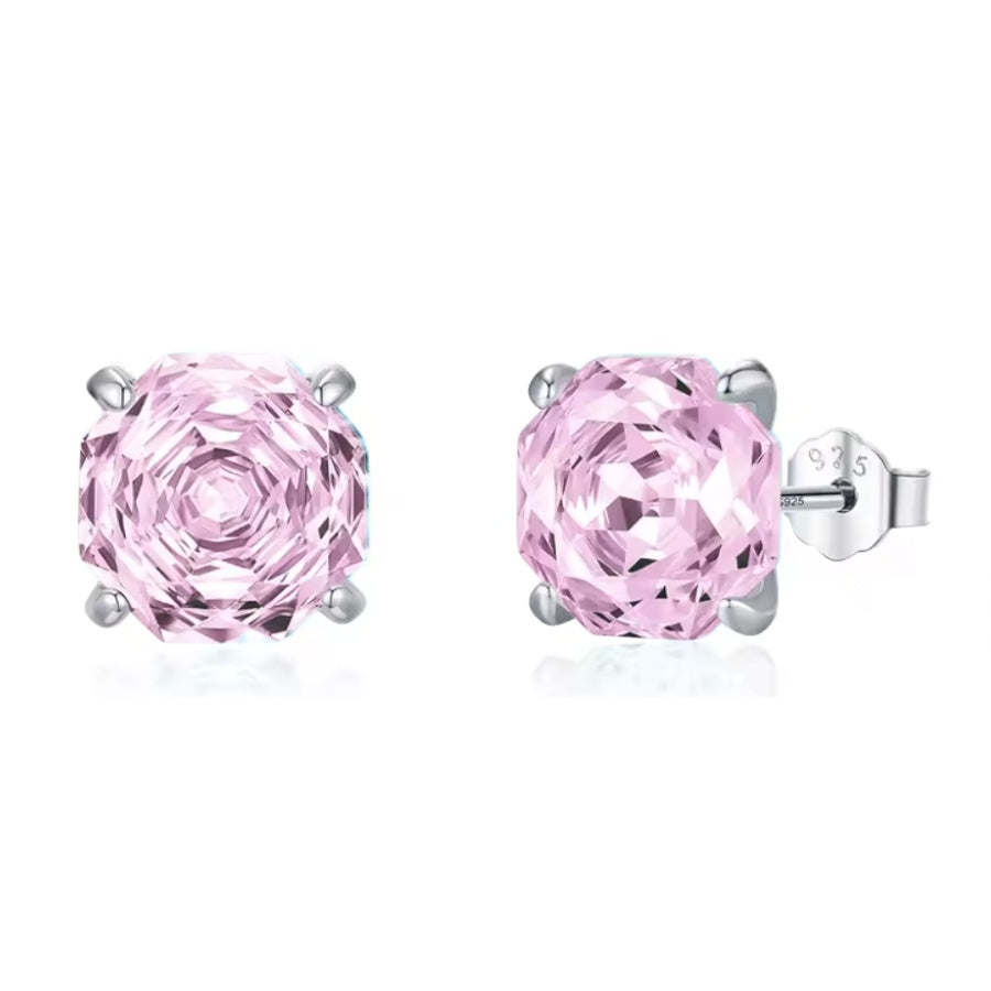 The Millenium Rose Cut Earrings bring a soft touch of colour to a timeless silhouette. Each earring features an 8 mm rose-cut blush pink diamond simulant, reminiscent of the delicate hue of pink sapphire, with facets that reflect light in a gentle, romantic glow. With an appearance equivalent to approximately 2 carats, the stones create an elegant statement while retaining a refined and graceful character. Perfect for adding a subtle hint of colour, these earrings lend effortless sophistication to both day and evening styling.
