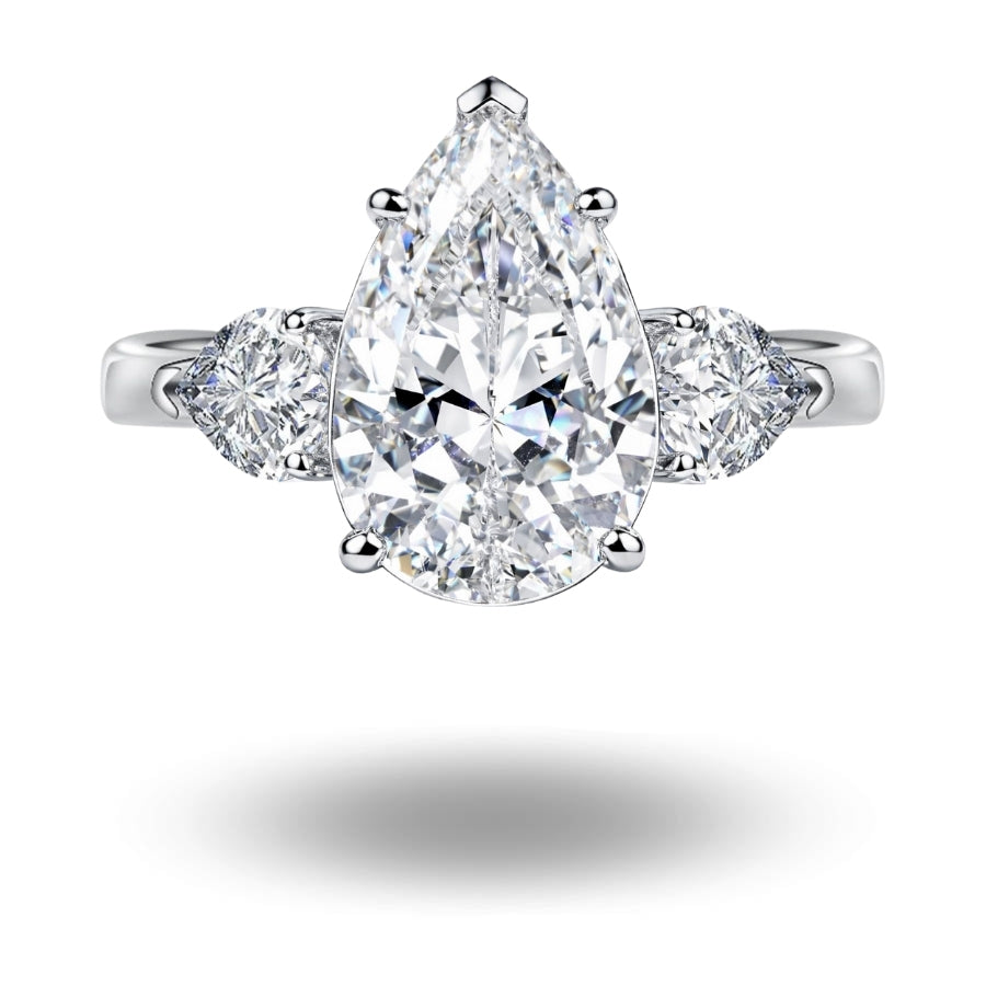 • Flanked by two pear-cut side stones for a balanced silhouette